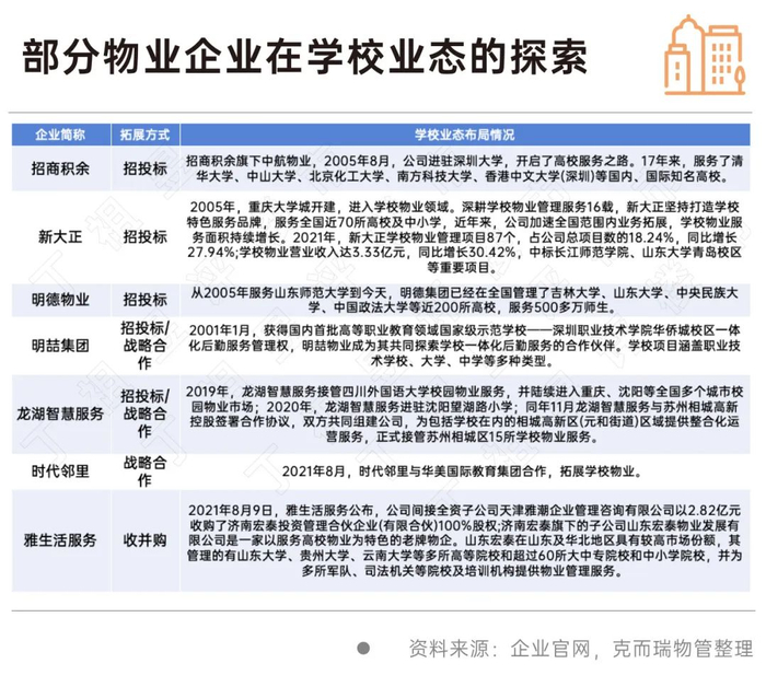 对企业而言,面对行业门槛较高、专业性较强的学校物业细分领域,这类物业企业主要通过公开招投标获取高校服务项目,虽然缺少校方提供的优质业务资源,但凭借优质的服务以及运营能力,在招投标中依然保有较高的竞争力,从深耕优势区域到全国性布局,逐渐扩大学校业态布局范围。