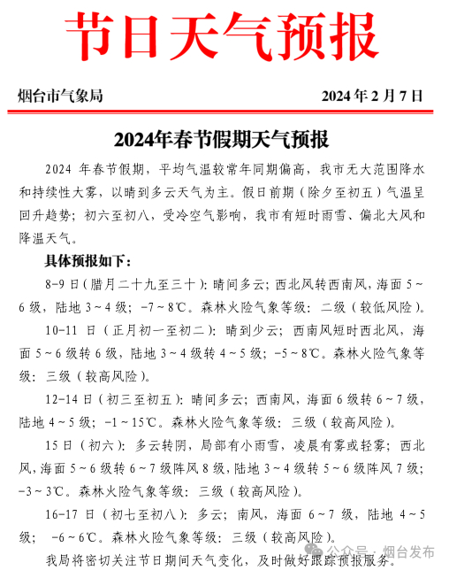 16-17日(初七至初八):多云;南风,海面6~7级,陆地4~5级;-6~6℃。森林火险气象等级:三级(较高风险)。