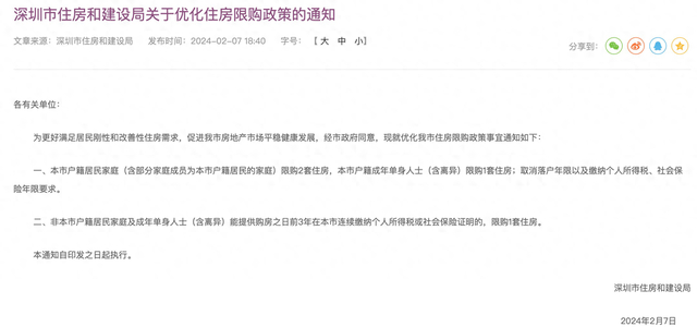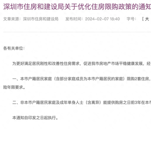 2月7日晚间,深圳市住房和建设局发布了《关于优化住房限购政策的通知》,松绑了深圳的购房要求。