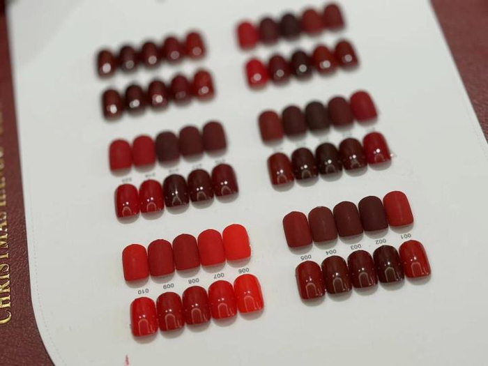 当然不少人年前会挑选红色系的美甲,店里摆上了红色的色板,方便顾客对比选择。