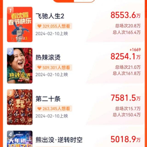 另据猫眼电影最受期待榜显示,截至2月7日,《飞驰人生2》同样以76.78万的想看人数居于榜首,而紧随其后的是《熊出没·逆转时空》和《热辣滚烫》。