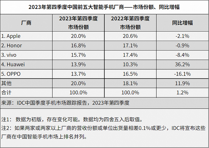 到了去年12月,同样是IDC发布的数据,在2023年四季度手机厂商出货量排名中,苹果以20%位列第一,荣耀、vivo、华为、OPPO紧随其后,小米则跌出了前五。