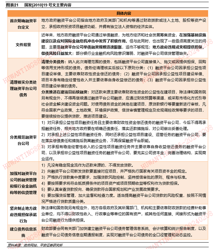 2010年6月国务院发布《关于加强地方政府融资平台公司管理有关问题的通知》(国发[2010]19号文),首次系统性遏制融资平台扩张,奠定了后续各类政策的基础。要点如下: