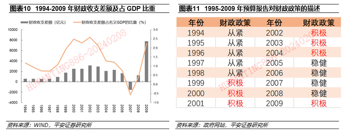 亚洲金融危机促使我国首次实施积极的财政政策,财政赤字率明显提升。1997年及之前我国财政非常注重收支平衡,少量的赤字更多是被动产生的,1994-1997年我国预算报告一直坚持从紧的财政政策,财政收支差额占GDP的比重平均为0.9%。1998年3月的预算报告仍然表示将实施从紧的财政政策,但是在8月就追加了赤字,当年实质上已经开始实施积极的财政政策。到2004年,我国已经连续实行7年的积极财政政策,这7年财政收支差额占GDP的比重平均为1.97%。