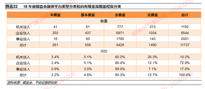 3)10月12日发布的银监发[2010]110号文:要求按自有现金流覆盖比例划分的全覆盖、基本覆盖、半覆盖和无覆盖平台贷款计算资本充足率贷款风险权重。按照银监会18年底数据,名单中全覆盖的融资平台数量最多,占比达到80%。
