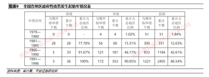 改革开放后,我国最早的地方债务发生在1979年,而1981-1985年大部分省级政府都开始举债。根据2010年的审计,我国地方政府负有偿还责任的债务最早发生在1979年,省级政府(含计划单列市)举借负有偿还责任或担保责任的债务的起始年集中在1981年至1985年,这一期间有28个省级政府开始举债。