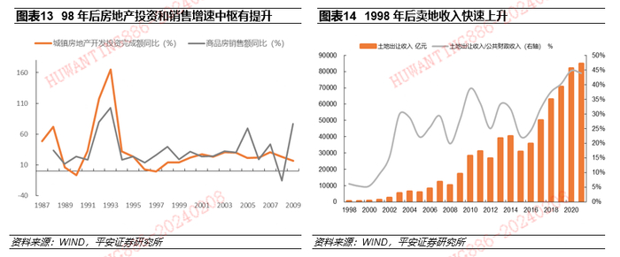 2)亚洲金融危机加速了我国房地产政策改革,激活了土地市场,使得土地财政渐渐成型。1991年国务院下发《关于全面进行城镇住房制度改革的意见》确定将公房的实物福利分配的政策逐步转变为货币工资分配的政策,但之后我国出现房地产泡沫和经济过热,因此实际推进较慢。1998年国务院发布的《关于进一步深化城镇住房制度改革加快住房建设的通知》明确提出“促使住宅业成为新的经济增长点”,并直接要求“停止住房实物分配”,这标志着国内房地产市场正式步入商品化阶段。根据“纳瑟姆曲线”规律,当城市化水平达到30%的临界值时,将进入加速城市化阶段,城镇化率快速攀升能为房地产爆发提供大量需求。1978-1996年我国城镇化率年均上升0.7个百分点,1996年全国城镇化率首次超过30%,1997-2009年我国城镇化率年均上升1.4个百分点。