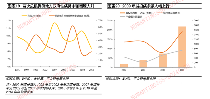地方债务更多属于逆周期工具,因此98年亚洲金融危机和08年全球金融危机后地方债务规模增速明显加快。根据《2011年第35号:全国地方政府性债务审计结果》,2010年前地方政府性债务增速最快的年份分别是98年和09年。城投债余额也在09年的鼓励政策支持下大幅上升194%,而产业债余额同期增速只有94%。2010年6月审计署首次披露了地方政府性债务信息,审计的是2009年底的存量债务,具体有以下特征:1)09年债务增速高达59%;2)存量债务中融资平台公司债务占比52%;3)政府负有直接偿债责任、担保责任及兜底责任的债务分别占债务总额的64.5%、11.8%和23.7%;4)政府性债务有96%用于交通运输、市政建设等公益性项目。