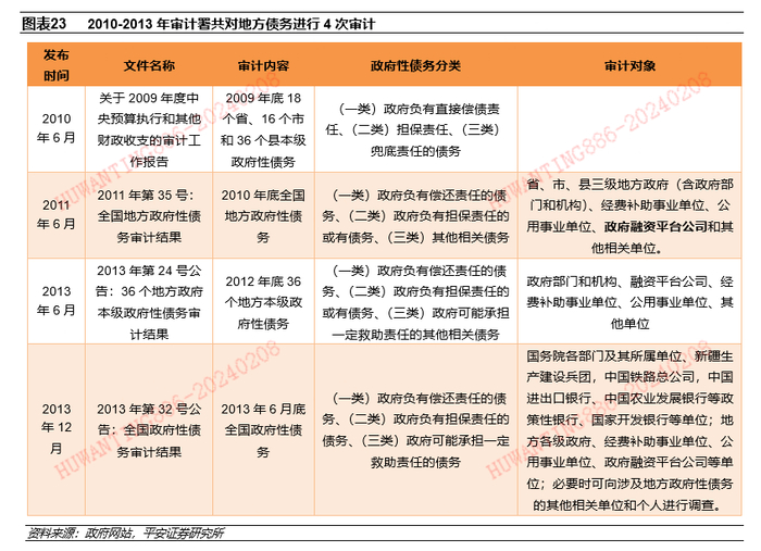 此时期审计署对地方债务进行了两次全面审计,为地方债务监管奠定了数据基础。2010年6月审计署首次披露了地方政府性债务审计结果,但仅针对部分地方政府,之后地方政府性债务成为2009-2017年地方债务的官方称谓。2011年6月,审计署首次披露了全国范围内的地方政府性债务审计结果,审计的是2010年底的政府性债务。2013年12月,审计署第二次公布了全国地方政府性债务审计结果,审计的是2013年6月底的政府性债务。