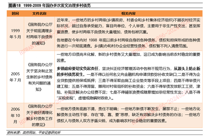 除了融资平台债务之外,这一时期地方政府还存在其他各种形式的债务,例如乡村债务。1999年国办就发文提到1998年之前乡村两级(乡镇政府、村委会和乡村集体经济组织)举借了大量债务。2005年国办发文提及了乡村债务的主要形式包括:向金融机构申请贷款弥补收支缺口、为企业贷款提供担保或抵押、由施工企业垫支等手段上项目等。