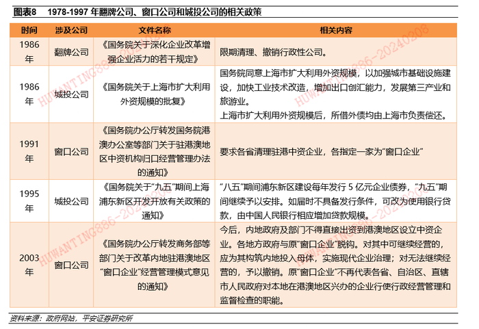 1)翻牌公司。改革开放后,国家尝试将国有资产的产权管理职能从政府的行政职能和一般经济管理职能中分离出来,一批原来承担着经济职能的政府部门开始变身为国有企业。但这类国企仍拥有原部门的管理权限,因此被称为“翻牌公司”。伴随着中央对地方的放权,地方政府也成立了一批“翻牌公司”,并依靠“翻牌公司”举借了债务。国务院逐渐认识到“翻牌公司”不利于真正搞活国有企业,因此在1986年下发《关于深化企业改革增强企业活力的若干规定》,要求限期清理、撤销这类公司。