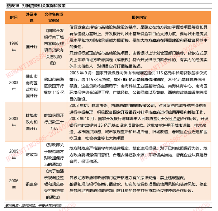 城镇化浪潮之下城投的作用更加凸显,绑定政府信用的打捆贷款模式就此诞生。98年房改激活土地市场后,城投在经济发展中的作用大大凸显,由此也衍生出了打捆贷款的模式。根据央行培训学院教授发表的《一分为二认识打捆贷款》,打捆贷款的模式最早是国家开发银行于1998年在安徽芜湖试点。当时芜湖提出一个城市基础设施项目打捆建设贷款,还款来源包括城市建设维护费、各种税、留给地方可支配的费等,并以土地出让收益做抵押。此后,打捆贷款被地方政府广为运用,除了国家开发银行以外,各商业银行也频频涉及。但打捆贷款模式违背了地方政府不得担保的规定,而且打包审批多个项目贷款的做法也违背审慎性原则,因此2005年和2006年监管明确发文禁止打捆贷款。