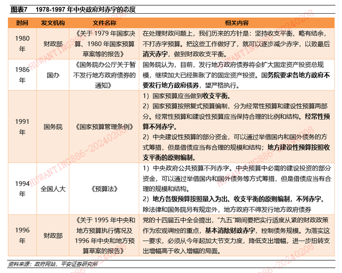 这一时期国债虽然重启发行,但中央对赤字的态度整体比较谨慎。国债虽然在1981年重启发行,但是发行规模非常有限,同时中央也不允许地方发债。1980年的预算草案就提到“不打赤字预算,以至最后消灭赤字,做到财政收支平衡”,之后数年的预算草案都延续了对财政平衡的重视。1991年《国家预算管理条例》规定我国要在1992年开始实行复试预算,明确经常性预算不列赤字,中央建设性预算可列赤字,说明中央开始承认赤字有一定合理性。1993年十四届三中全会要求“中央财政赤字不再向银行透支,而靠发行长短期国债解决”,于是1993年成为我国财政向央行透支的最后一年,使得1994年我国国债发行量大增,也代表了中央对赤字的态度发生一定转变。但《国家预算管理条例》同时也强调国家预算应收支平衡,1995年召开的十四届五中全会更是提出“基本消除财政赤字”,说明1991年-1997年我国整体上仍然对财政赤字较为谨慎。