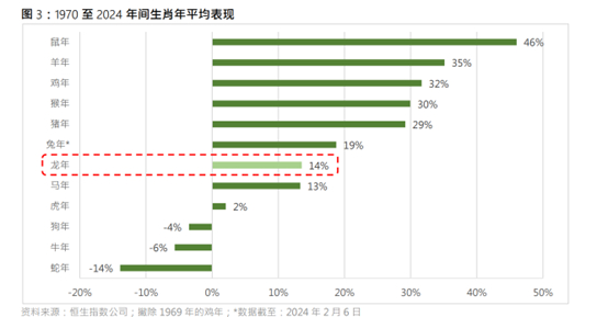 根据恒生指数公司的报告,恒生指数的往绩表现或可缓解投资者的忧虑,历史数据显示,龙年在过往生肖周期中都有正回报,平均升幅更达14%。