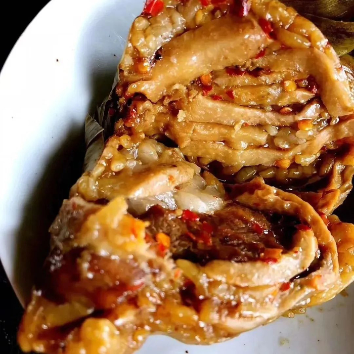 衢州芋头粽的馅料就是一大块肥多瘦少的猪肉、本土芋头,以及辣椒。芋头软烂,和糯米连为一体,两种质地不同的碳水塑造出层次丰富的口感;肥肉油润,蒸的过程中呈现半融状态,渗入糯米和芋头的间隙之中。