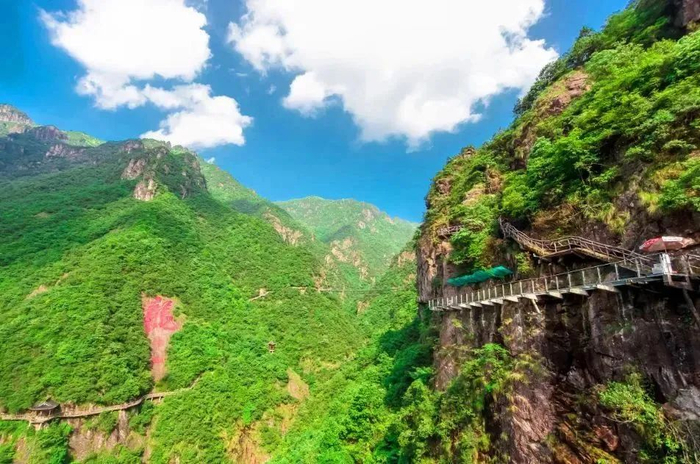 天脊龙门位于衢州市衢江区黄坛口乡下呈村,平均海拔在1000米以上的山峰就有54座,沟谷更是深达几百米,地势蜿蜒复杂,宛若游龙盘踞于此。走在栈道,仰望天空,就像穿梭在飞天之上。