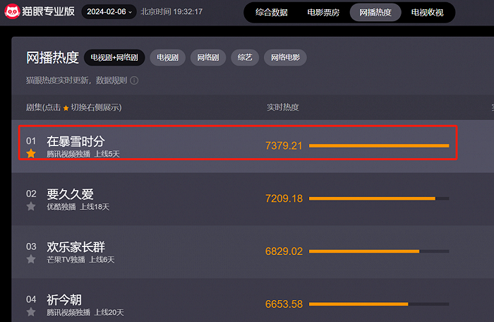 由于该剧率先播出,目前已经积累了一定的传播信息,截止2月6日,在猫眼专业版和云合数据上,分别位居第一、二名,成绩不错。