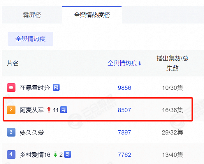 爱奇艺的另一部《阿麦从军》是由爱奇艺出品,田少波执导,张天爱领衔主演,张昊唯、王瑞昌、高戈等主演的古装励志传奇剧。该剧于2024年1月31日播出,目前云合数据显示舆情热榜排名第二,线上话题讨论较为热烈。