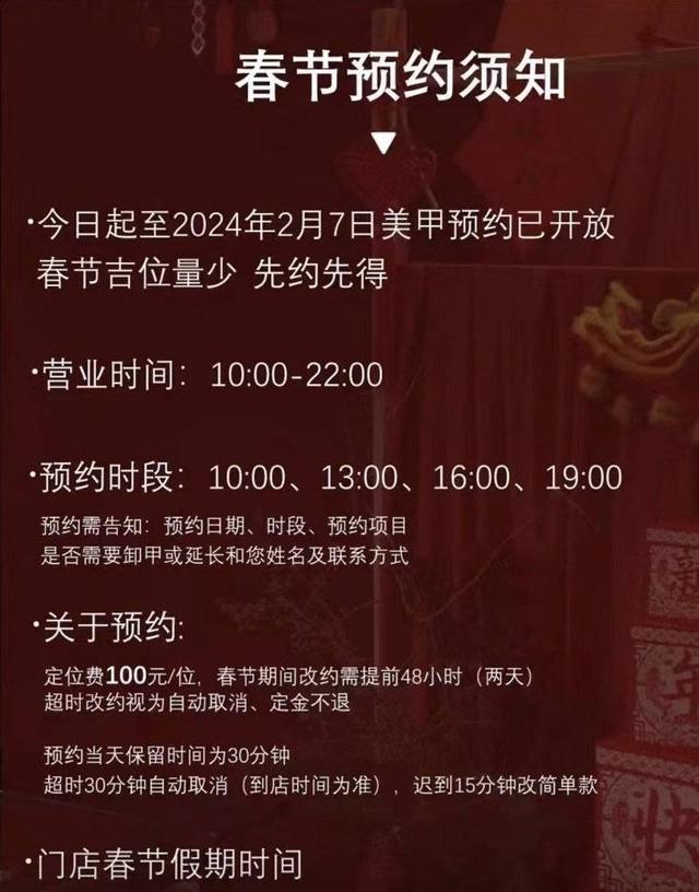 记者看到,成都另一家知名美甲店早在1月22日就发出了通知:“节前位置几乎约满,开放节后预约位置”。据了解,该店还规定春节期间需要收取100元的定位费,如果不是提前2天改约则不退定金。尽管这些规定看起来像“霸王条约”,加上该店客单价偏贵,但还是有客人愿意等待,甚至有客人从外省慕名而来。