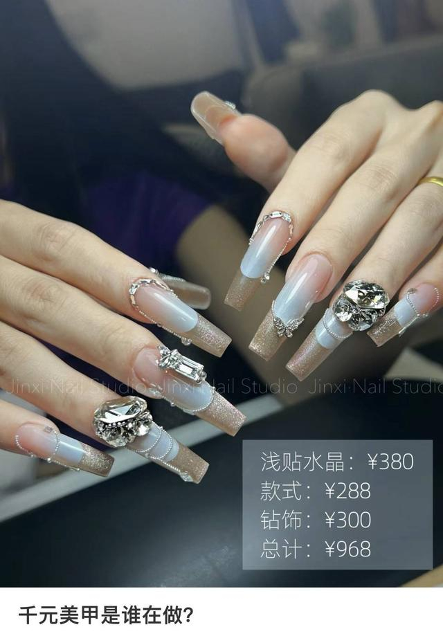 王晶还介绍,比如美甲贴钻,普通钻和施华洛世奇水晶价格千差万别,如果涉及手绘、雕花等用到金箔、贝壳饰品,肯定价格会更贵,所以会出现上千元的美甲。目前没有统一标准,一般来说连锁店比一些小店的价格会透明一些。
