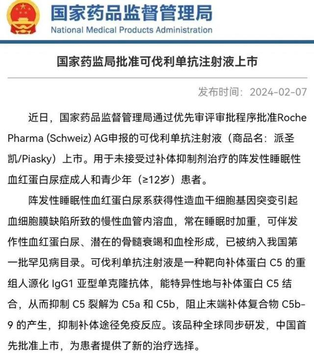 2月7日,罗氏制药中国宣布,中国国家药品监督管理局(NMPA)批准可伐利单抗(商品名:派圣凯®)用于未接受过补体抑制剂治疗的阵发性睡眠性血红蛋白尿症(PNH)成人和青少年(≥12岁)患者。
