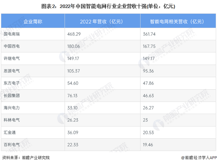 智能电网行业当前尚未有权威机构进行排名,因此前瞻通过智能电网企业中相关领域的营收情况进行排名,间接反映厂商在行业中的竞争力,具体情况如下: