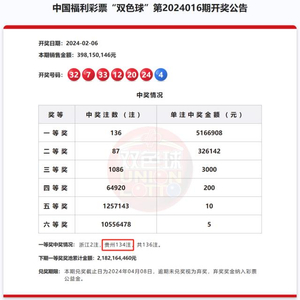 2月7日,贵州开出双色球6.8亿元巨奖的新闻引发网络关注。据中国福彩官网,2024年2月6日晚,福彩双色球第2024016期开奖,同时也是兔年最后一期双色球开奖。本期一等奖开出136注,其中有134注来自于贵州,单注奖金516万余元,总奖金达到6.8亿多元。