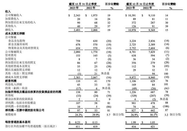 百胜中国2023年同店销售额增长4%,高于2022年同期的-4%;2023年全年则为7%,高于2022年同期的-7%。