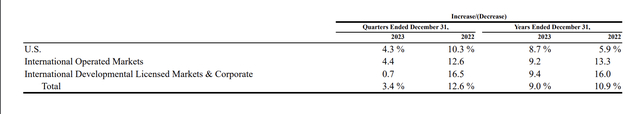 从同店销售额来看,2023年四季度,麦当劳全球同店销售额增长3.4%,且所有细分市场的同店销售额均呈正值。其中,美国市场上涨4.3%,国际运营市场增长4.4%,受中东战争影响,国际开发许可市场增长仅有0.7%。尽管2023年第四季度,麦当劳的营收仍然实现了正增长,但相比2022年四季度所有细分市场10%以上的增速,有着明显的放缓。