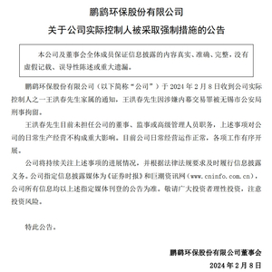 2月8日晚间,鹏鹞环保4,股价4.65元,市值36.85亿元)发布关于公司实际控制人被采取强制措施的公告称,公司于2024年2月8日收到公司实际控制人之一王洪春家属的通知,王洪春因涉嫌内幕交易罪被无锡市公安局刑事拘留。