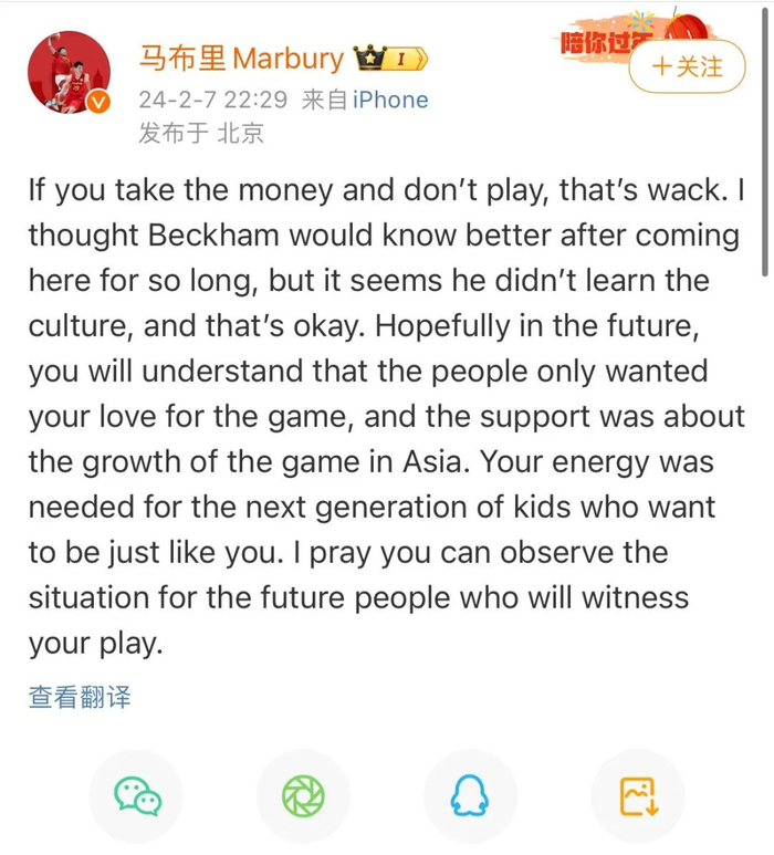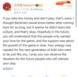 “我原以为贝克汉姆来这么久了应该更了解,但他似乎没学到这里的文化,这没关系。希望未来你会明白,人们只想看到你对这项运动的热爱,这些支持也是为了这项运动在亚洲的发展。那些想要成为你这样的球员的孩子们需要你的能量。我希望你可以为那些未来看你比赛的人审视当前的状况。”