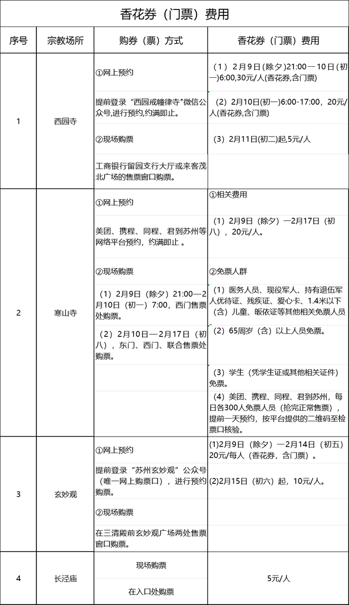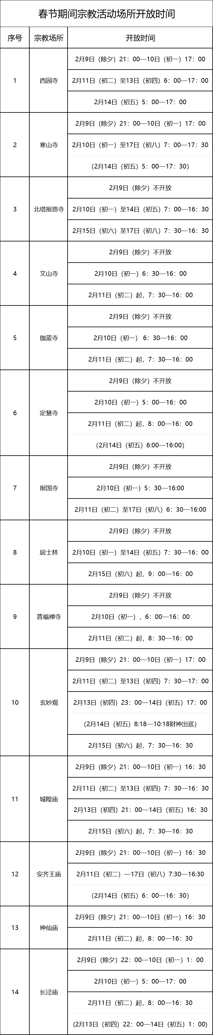 2024年2月9日(除夕)至2月17日(初八)期间,姑苏区辖区内共有西园寺、寒山寺、北塔报恩寺、文山寺、伽蓝寺、定慧寺、报国寺、居士林、普福禅寺、玄妙观、城隍庙、安齐王庙、神仙庙、长泾庙14处佛道教场所对外开放,花神庙暂不对外开放。具体开放时间如下: