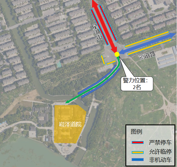 前往崧泽道院的市民,可将机动车停放至蔺谊路道路两侧,非机动车可停放至前往道院的内部道路两侧,星湖街两侧禁止停车。