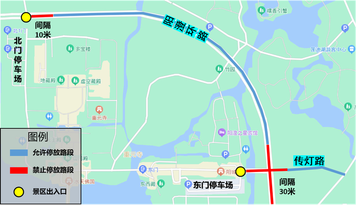 ①当重元寺北门、东门停车场饱和时,执勤警力将引导车辆至传灯路道路两侧及阳澄环路重元寺北门至传灯路道路两侧停放(交叉口50米范围、出入口两侧各10米、公交站30米范围除外,执勤警力将提前放置反光锥筒)。