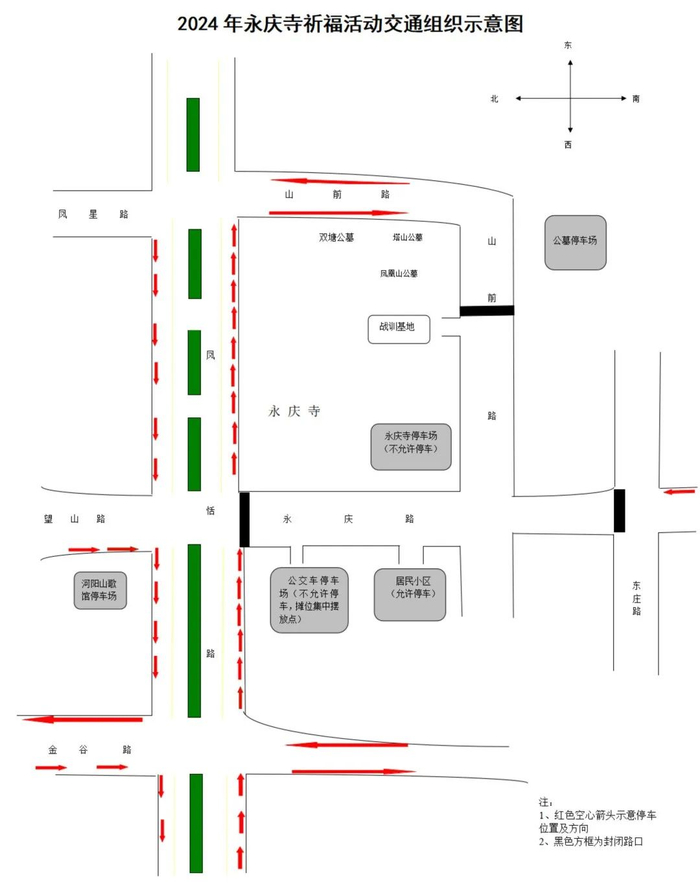 祈福活动期间,2月9日21点至2月10日凌晨2点,永庆路(凤恬路至东庄路),山前路(永庆路至战训基地)禁止机动车通行。