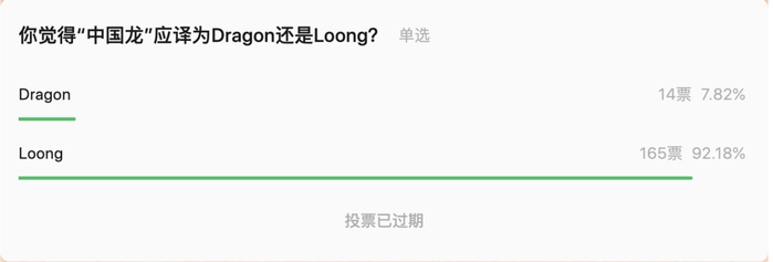 微信公众号“上海文联”曾对“Loong”的接受度进行过调查,参与投票的网友中,超过九成在“Loong”和“Dragon”之间选择了“Loong”。