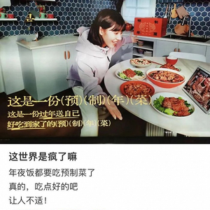 春节前,这张女孩吃着预制菜和家人“电子团圆”的广告图,本来是想狠踩“除夕不放假”的热点宣传预制菜,但没想到,直接戳穿了打工人的肺管子。“三十不放假本来就比较郁闷,结果还让我大过年一个人吃预制菜?”“真的惨,又PUA打工人”。