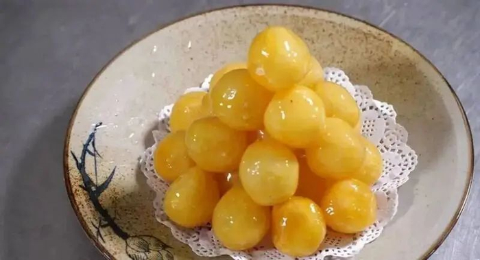 玲珑剔透的“空心琉璃丸子”,是一道集美味、营养于一身的鲁菜,这道菜不加任何发泡剂,纯用淀粉加工而成,待丸坯炸成金黄色,放入熬制好的糖液中颠翻均匀,冷却后盛入盘中,犹如颗颗珍珠落入玉盘,玲珑剔透,金光闪闪,极考验厨师的水平。