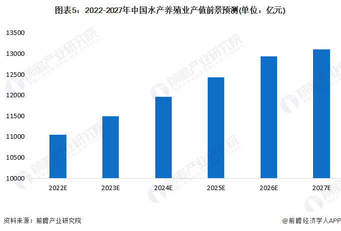 前瞻产业研究通过测算,预计2022-2027年中国水产养殖业产值将以CAGR4%左右的增速上升至2027年超过1.3万亿元。