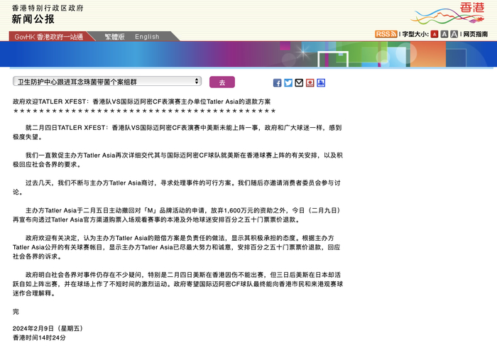 公报同时指出,香港特区政府明白社会各界对事件仍存在不少疑问,特别是梅西2月4日在香港因伤不能出赛,但3日后梅西在日本却活跃自如上阵出赛,并在球场上做了不短时间的激烈运动。香港特区政府希望迈阿密国际队最终能向香港市民和来港观赛的球迷作合理解释。