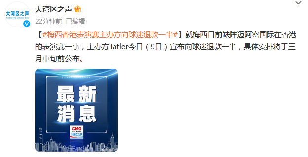 据大湾区之声微博9日发文,就梅西日前缺阵迈阿密国际在香港的表演赛一事,迈阿密国际队与中国香港明星队表演赛主办方Tatler Asia9日今日(9日)宣布向球迷退款一半,具体安排将于三月中旬前公布。