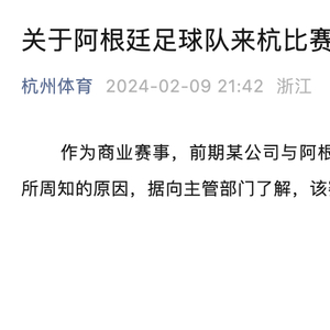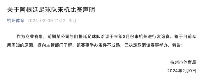 2月9日,杭州市体育局发布关于阿根廷足球队来杭比赛声明,作为商业赛事,前期某公司与阿根廷足球队洽谈于今年3月份来杭州进行友谊赛。鉴于目前众所周知的原因,据向主管部门了解,该赛事举办条件不成熟,已决定取消该赛事举办。