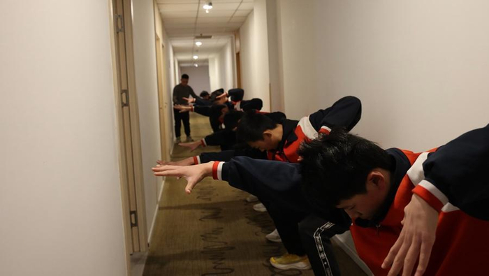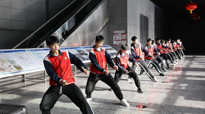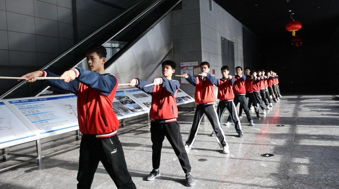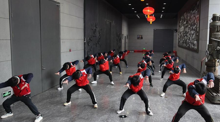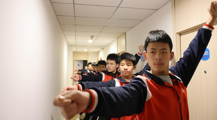 对于武术人而言,更加舞蹈化的动作需要极好的乐感,越是短短几分钟的呈现,其质量要求就越高。加之伴奏音乐几经修改,给表演者提出了更高的要求,要快速适应进入角色,尽快融入到节目中来。怎么办?还是从老古语“勤能补拙”做起。深夜,其他参演人员都离开了演出场地,中华武校的演员们依旧在加班加点;休息时段,大家集中在走廊里、宿舍中,一点一滴地研磨,一遍一遍地和音乐、对拍子;一起看视频,找差错,再练习。在这种常态化的生活节奏下,大家已经有点“成魔”了,连走路都在合拍子比划动作,有的学生打趣说做梦都在练习动作,有时都能比划醒了。