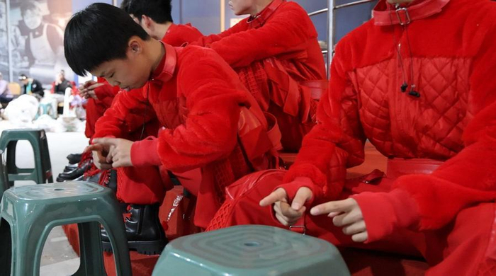 导演在挑选演员时十分严格,要求具备很强的身体素质,特别是身体协调性要好、腿部手臂力量要强、背部拉动力要大。经过精挑细选,30名好身手的学生脱颖而出,于1月10日开始春晚节目的排演。按照导演的要求,从简单的挥槌动作练起,陌生的动作历练千次万遍,掌握的技术熟能生巧。之后就是真的敲响道具,站立的姿势要正,持槌的手要稳,击打的角度要准,击响的节奏要统一,每一个细节都容不得丝毫马虎。再然后,腿部、手臂、颈肩、膝关节力量爆发要协调一致,动作要流畅而不生硬,击打的声音要洪亮,从一个同心圆看过去,一列18人的表演就像1个人,展现出“工业”“工匠”的精准细腻和豪迈气势。