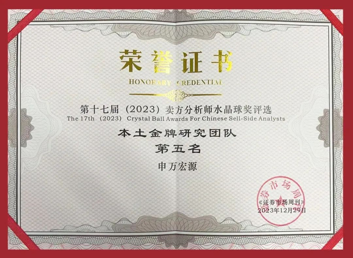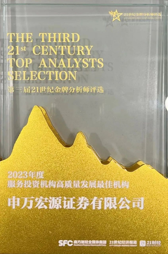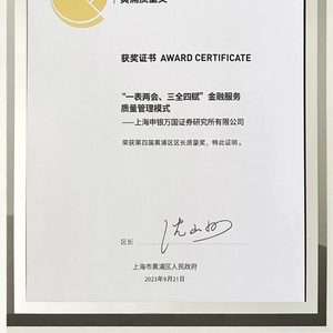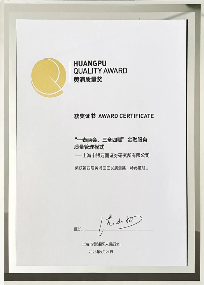 2023年,申万宏源研究特有的“一表两会、三全四赋”金融服务质量管理模式获得第四届黄浦区区长质量奖,此次获奖是对研究所三十多年来始终如一地在行业发展、客户服务、产品创新等方面高质量发展的肯定。