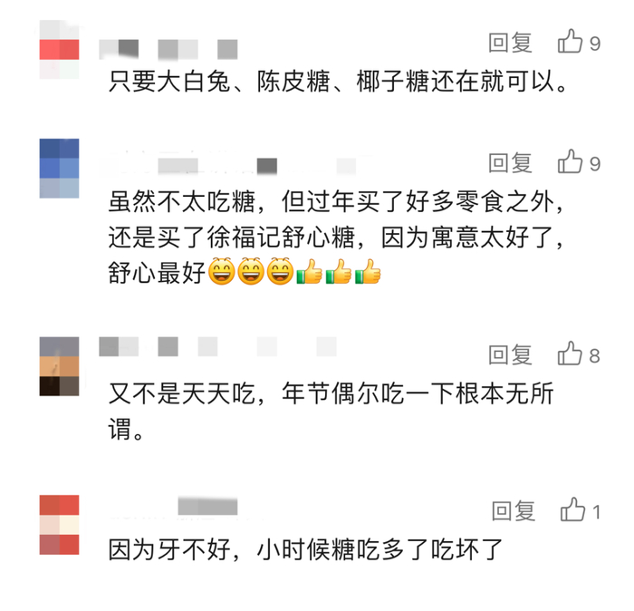还有网友说,明明记得以前很喜欢吃,小时候家里阿尔卑斯、悠哈悠哈、牛轧糖、水果软糖没断过,但现在基本不吃糖,只有喝喜酒的时候,还有在餐厅等位会拿一两颗陈皮或是薄荷糖。