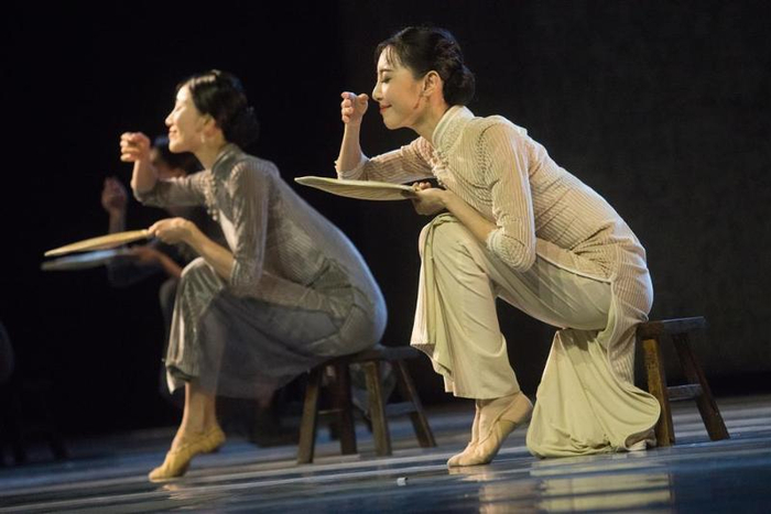 《咏春》“两年多前,我们去佛山采风,看到很多戴着斗笠的劳动妇女,皮肤黝黑,满身是汗,深切感受到南岭女子的美。”周莉亚表示,“我们拍了很多劳动场景的照片,想着如果做岭南题材作品,一定要把这一幕放进去。”为什么韩真、周莉亚作品一次又一次出现女子群舞?韩真表示,这来自舞蹈学院教育,“从我们读书起,中国主流舞剧受到俄罗斯芭蕾影响大。老师在赏析课强调,要有独立展示的舞段,可以推广和传播。音乐剧、歌剧有咏叹调,能单独演出。舞剧也有自己的基本框架。”面对越来越眼尖与严格的庞大观众群,大名鼎鼎的中国舞剧双子星如何突破自我,创作出让人耳目一新的精品力作?周莉亚说,“‘电波’故事性强,线性叙事中有倒叙和快进,‘青绿’层层递进,跳入历史,带观众看到希孟,感受《千里江山图》在诞生900多年后的意义。《咏春》在电影片场和武馆街交错,叶问去香港,大春到片场,都有彷徨和困境,都在追求理想,我们在寻找不同的空间叙事手法。”“每部作品都有难度,创作就是攻克难关。”韩真、周莉亚如何打破作品既定印象,带来惊喜?“李侠、希孟、叶问……我们在他们的身份下感受痛与乐,带入创作的感动。《只此青绿》容易挖到宏大的历史切面,让人热血澎湃。《咏春》也能做得很燃,比如一个打十个,比如国仇家恨,票房一下就能涨上去。但在今天的时代,我们想发出自己的声音,而不是复刻电影。每次尝试都有风险,也许没那么完美,我们作为从业者的想法,交给观众评说。”