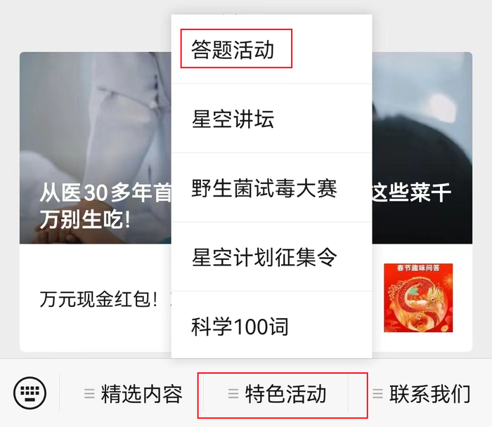 进入底部菜单栏,点击“特色活动”——“答题活动”
