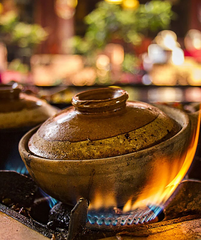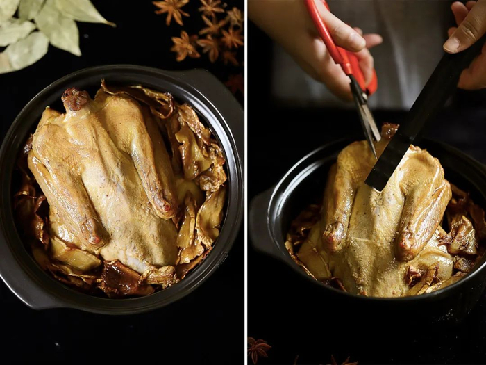 整鸭放入砂锅中,一锅一炖,每只鸭子都需要在砂锅中慢炖90分钟,煮到干香四溢,浓郁的姜味渗入鸭肉中,演变成金黄的色泽。