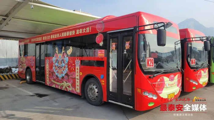 最泰安讯 为了让广大市民和乘客感受到浓厚的节日氛围,给泰城增添喜庆色彩,鼓励大家绿色低碳出行,市公交公司又添四台龙年新春贺岁主题公交车,分别投放在4路、29路、6路公交线路上运行。